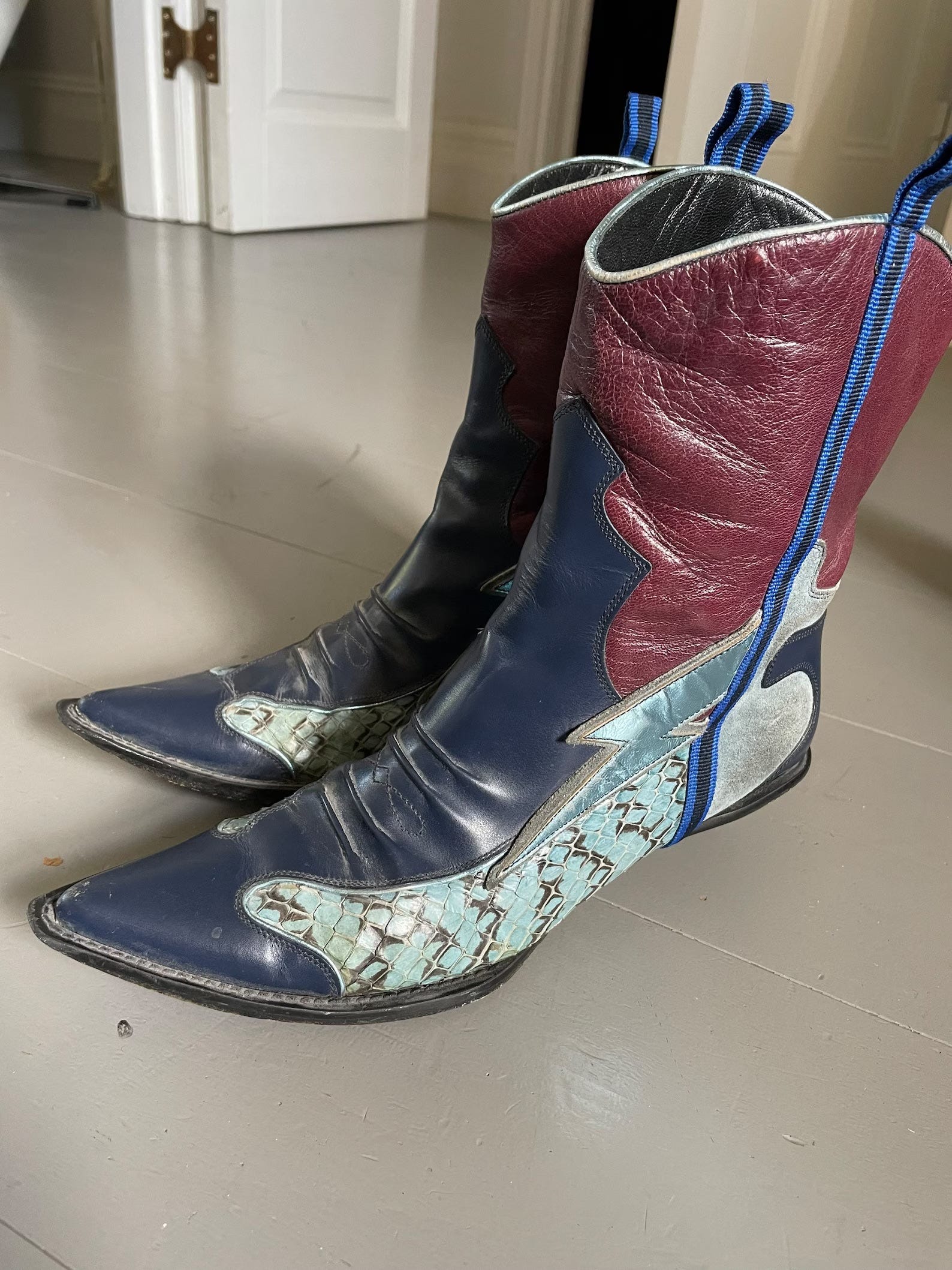 So, what makes the most exciting kooky cowboy boot? It comes down to color and texture. I gravitate toward boots of multiple hues, often mismatched and unexpected and even better if they have different fabrications—pony hair, lizard, or at the very least, some kind of epic embossing and patchwork. If you can, you should always opt for leather over synthetics. They last longer and look so much better in boot form. Vintage is the way to go most of the time, because zany cowboy boots look even cooler when they’re worn. There’s nothing worse than a pair of boots that look too pristine.