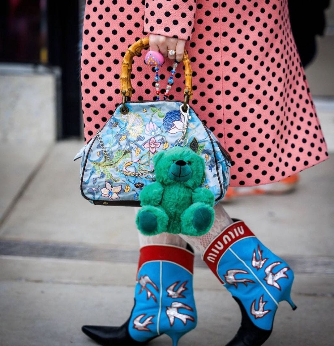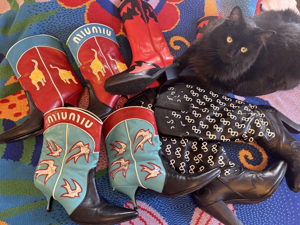 Cowboy boots have been an obsession of mine for the past few years. It all started with the Miu Miu cowboy boots from resort 2016 (my favorite Miu Miu collection of all time). Imagine! Mrs. Prada’s signature off-kilter color combinations, covered in a sea of Miu Miu-isms and subversive brand codes: silver foiled sparrows and yellow cats galore. These were followed by my logo Saks Potts black leather cowboy boots decked out in little “SP”s. What does that mean, people ask me. Someone in the airport once asked me if they were Palm Springs merch. A new forever favorite? The Molly Goddard Dora boots in pink and red (a gloriously rich, personal favorite color scheme of mine) topped off with little hearts on the toes. We all know cowboy boots have taken flight toward becoming an everyday wardrobe staple with the nuanced coastal cowgirl trend, but in the words of Nicki Minaj, “Who wants to look simple when you can look stunning?”