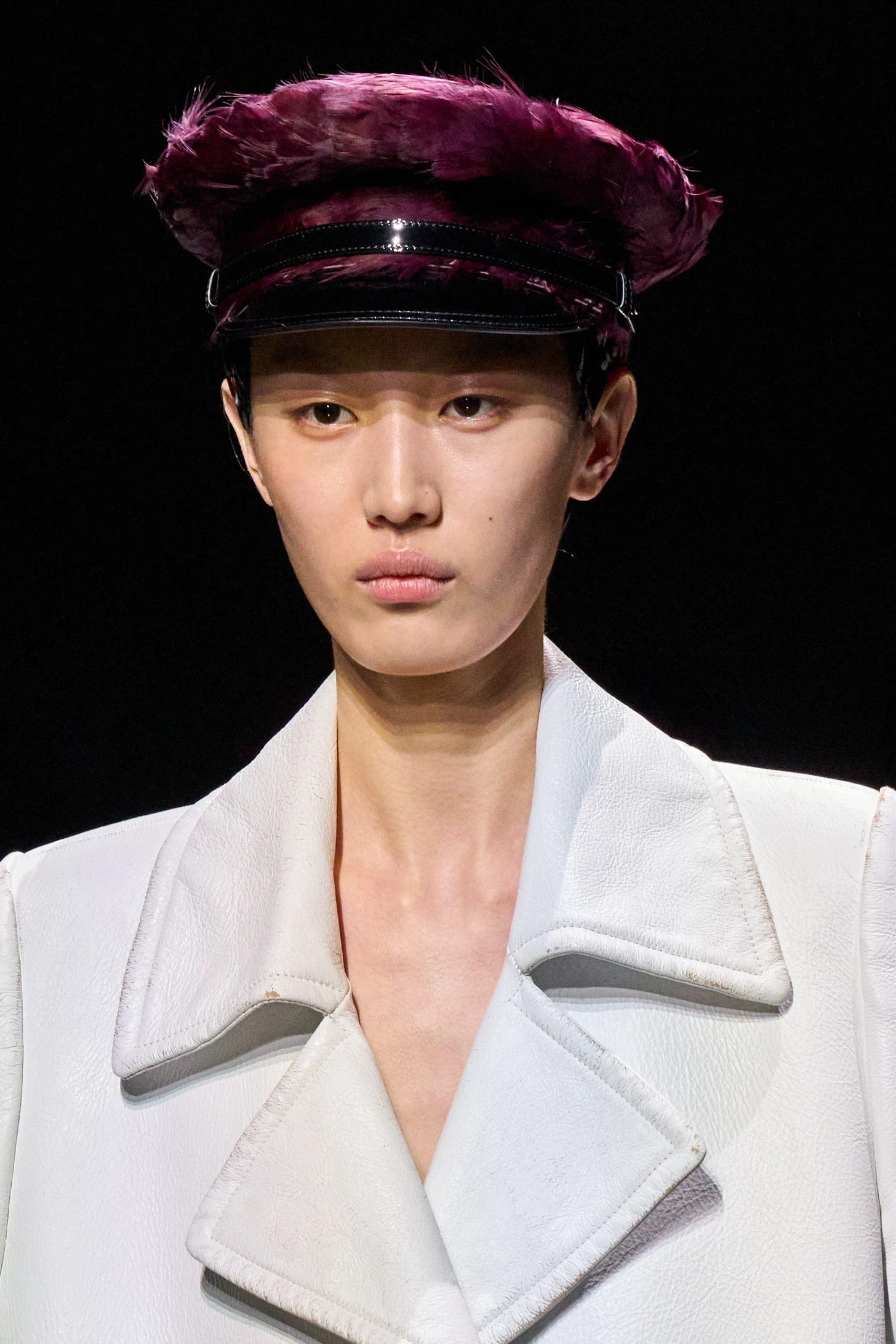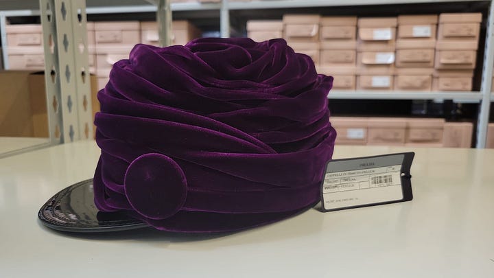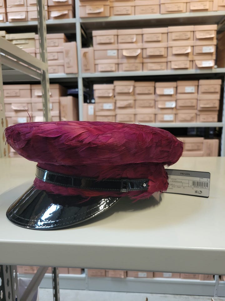 I purchased the burgundy feather newsboy cap as well as the wrapped purple velvet mini turban baseball cap from the Prada fall 2024 runway collection, both for insane prices considering they retailed into the thousands. I collect old Miu Miu (check out my book here) and old Prada and these pieces feel true to the older, weirdo chic maximalist aesthetic.