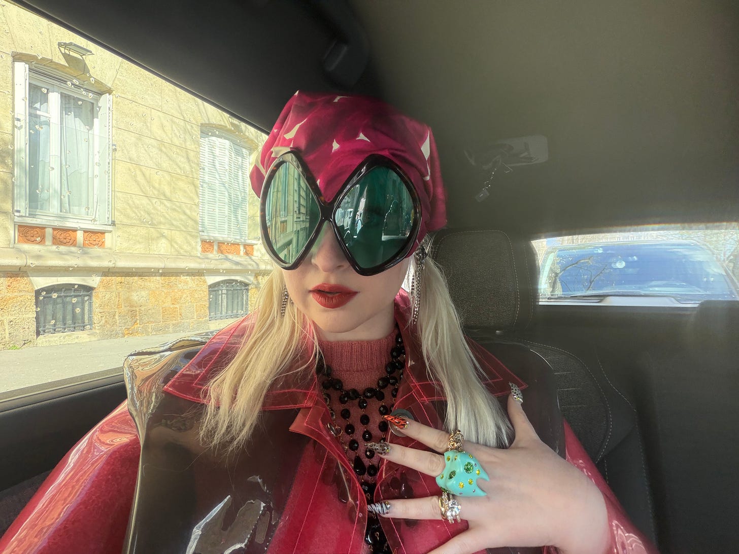 I was also shocked to see the mysterious Prada scarf sunglasses from the spring 2025 runway—which I had to buy. I saw someone post on Instagram that only three of them were produced, and someone else said they’re impossible to find. I’m not sure if either one is accurate. But I do know I’ve never seen them anywhere else. I wore them to the Miu Miu show the next day.